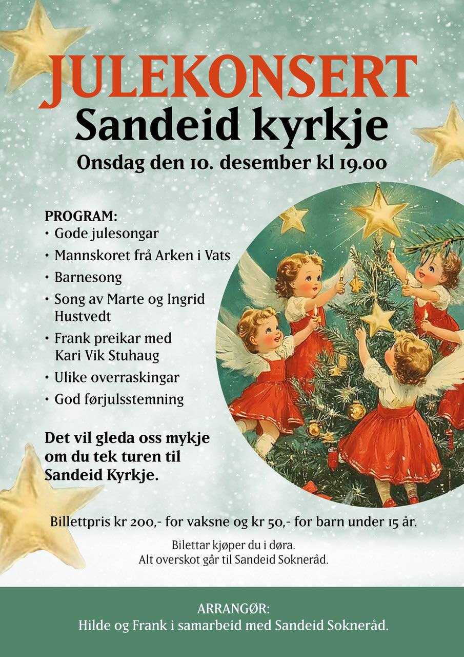 Onsdag 10. desember kl. 19.00 inviterte Frank og Hilde Bj. Abelseth i samarbeid med Sandeid sokneråd, til konsert i Sandeid kyrkje. Her var dyktige musikarar, allsong med gode julesongar; Mannskoret frå Arken i Vats; Barnesong; Song av Marte og Ingrid Hustvedt mm.