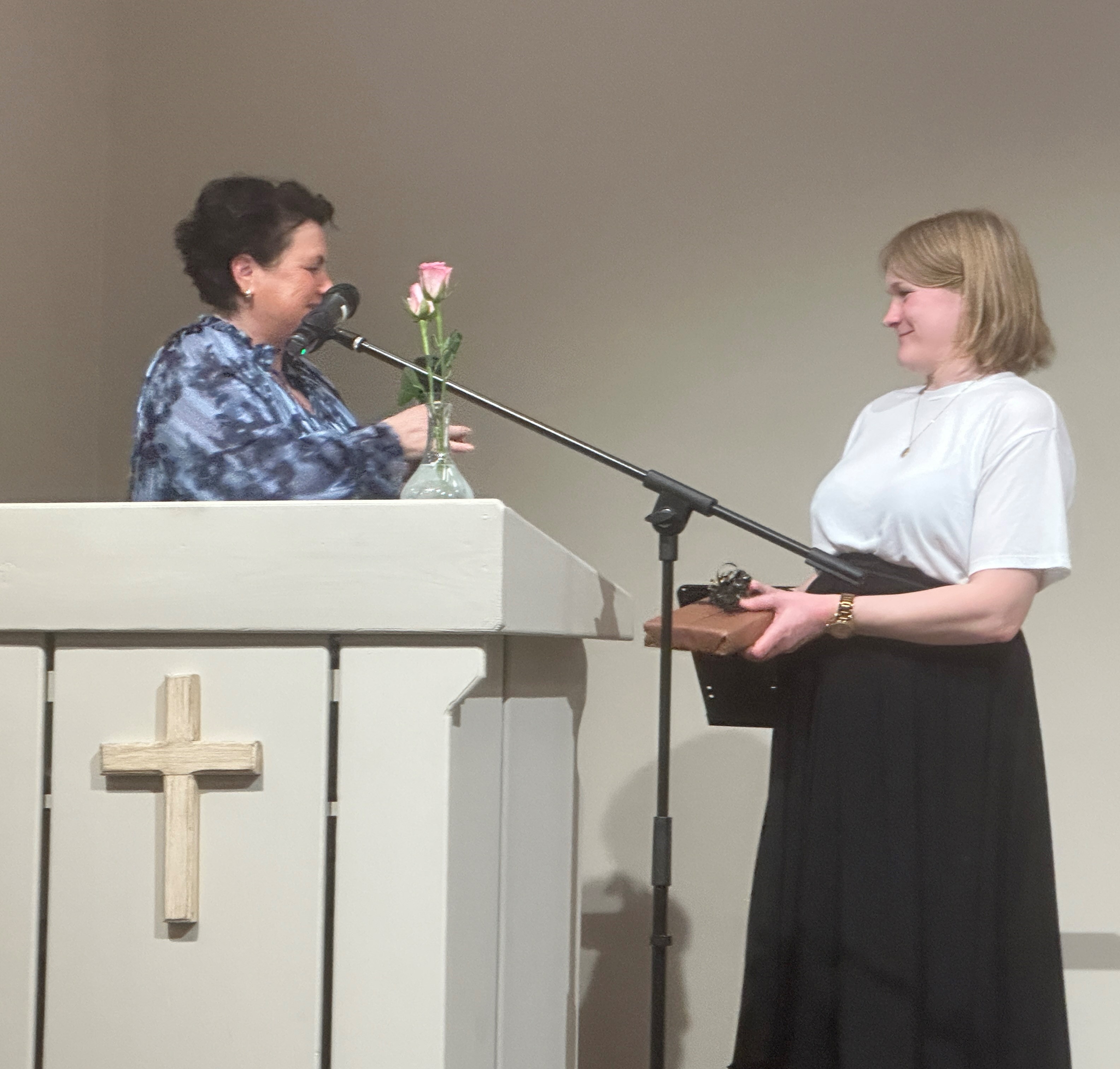 Bilete: Ny leiar Iren Eike takka Sunniva Tveit Gregersen for 4 år som leiar for soknerådet. Ho sit som vanleg soknerådsmedlem ut perioden. (Foto Steinar Skartland)