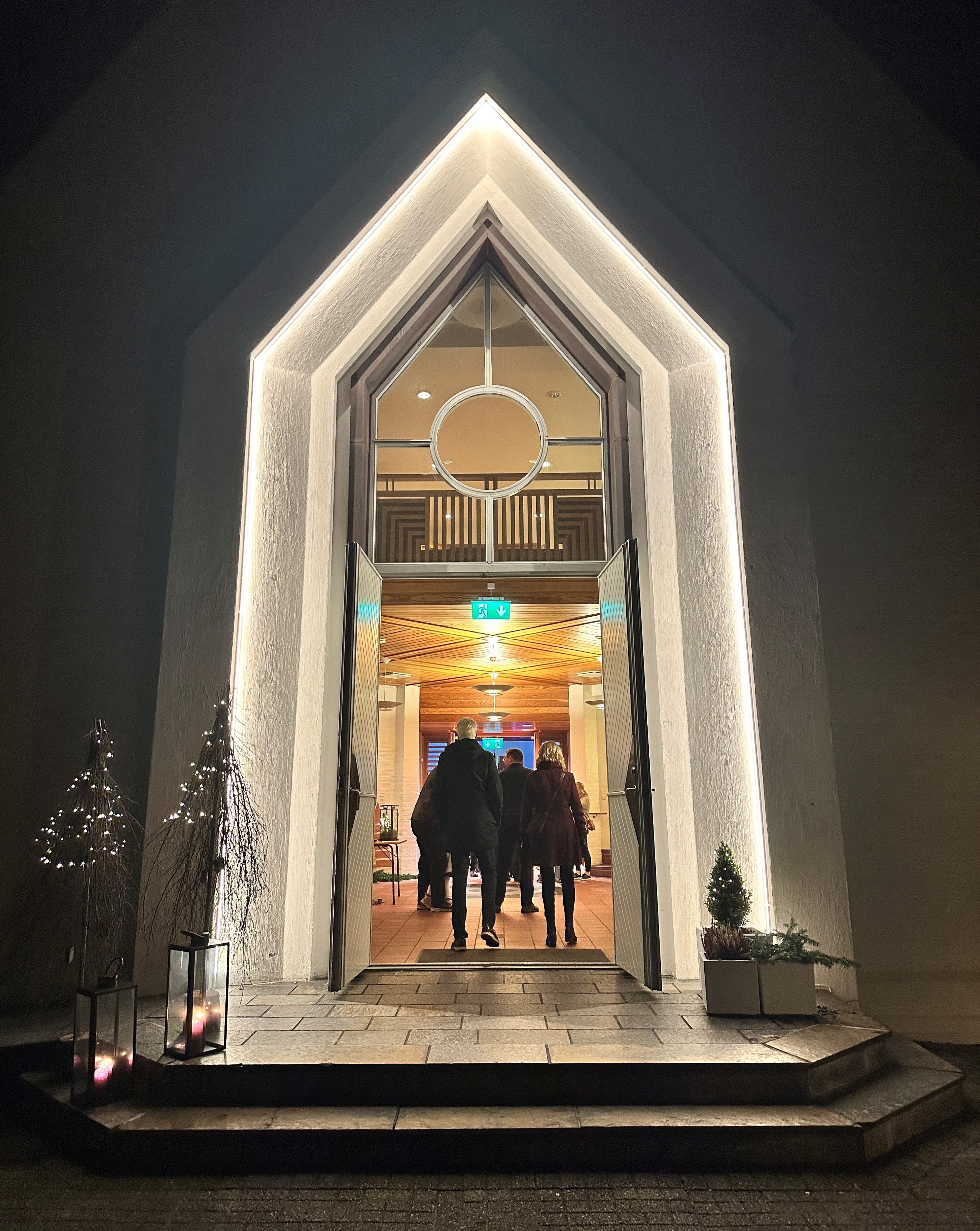 Det var vel verdt å ta turen til Skjold kyrkje denne søndagen, om ein kom til den første eller den andre konserten same dagen. Like fullt var det begge gonger. Inngongensdøra lyste vakkert mot dei som kom til kyrkja.